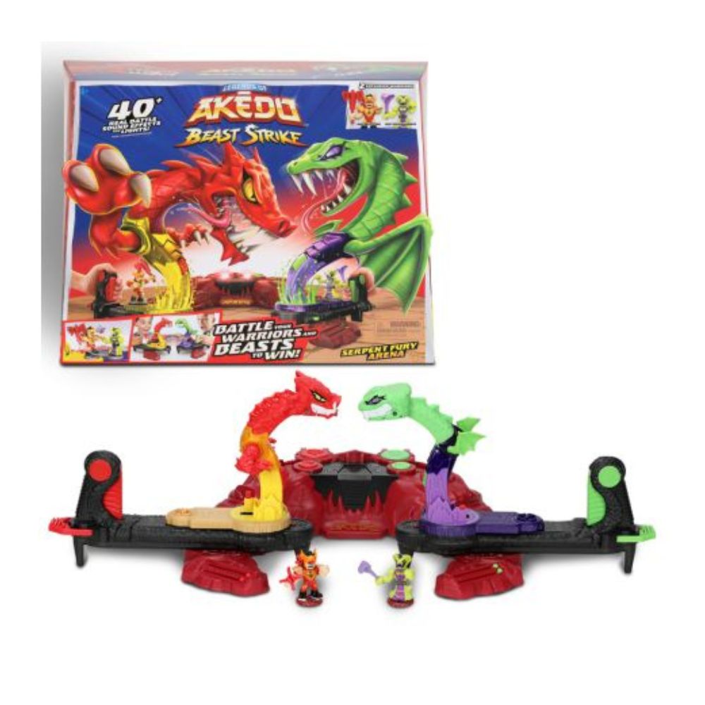 Step into the thrilling world of Akedo with the Serpent Fury Arena, where epic battles come to life! Designed for kids aged 6 and up, this action-packed arena features three unique ways to fight: battle between warriors, beast versus beast, or warrior versus warrior. Equipped with two exclusive warriors—Beast Realm Viperwrath and Beastmaster Chux—along with his Legendary Beast Blade, players are ready for intense face-offs.
