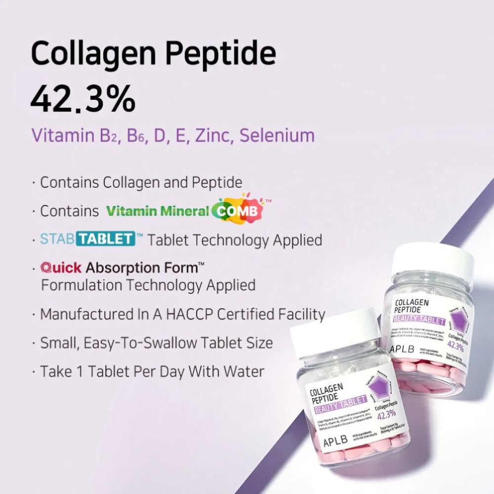 The APLB Collagen Peptide Beauty Tablet is a skin-nourishing dietary supplement formulated with low molecular Collagen Peptides to support skin elasticity, firmness, and hydration from within. Each tablet delivers concentrated beauty nutrients that help reduce fine lines, improve skin texture, and promote a radiant, youthful glow.