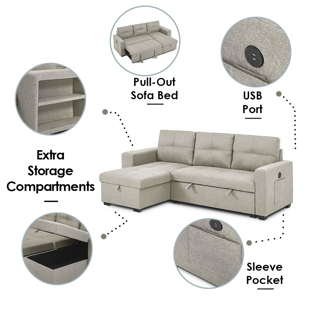 Designed with convenience, this sofa bed features a pull-out function for easy conversion into a bed, making it ideal for accommodating guests. Additionally, the sofa includes storage compartments and sleeve pockets, providing practical storage solutions for your belongings. The chaise position is reversible, allowing you to customize the layout according to your needs. For added convenience, the sofa is equipped with a USB port, making it easy to charge your devices while you relax.