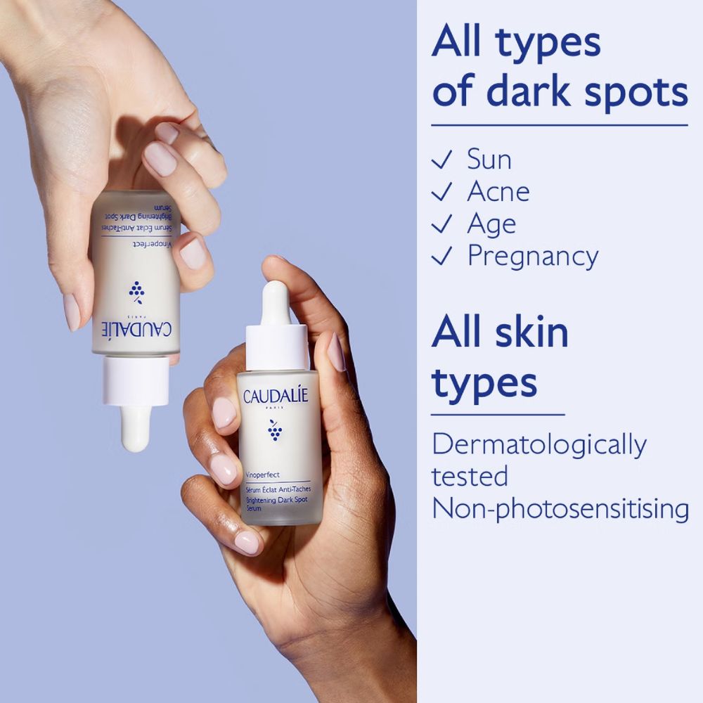 Achieve a radiant, even complexion with Caudalie Vinoperfect Brightening Dark Spot Serum. This highly effective serum is formulated with patented Viniferine, a natural ingredient derived from grapevine sap, renowned for its exceptional brightening properties. Ideal for all skin types, this lightweight serum works to visibly reduce the appearance of dark spots and even out skin tone, leaving your skin looking luminous and revitalized. Infused with olive squalane, this serum deeply hydrates while the natural fragrance of mint, caraway, and galbanum invigorates your senses. Non-comedogenic and oil-free, it is perfect for daily use, delivering noticeable results without causing irritation.