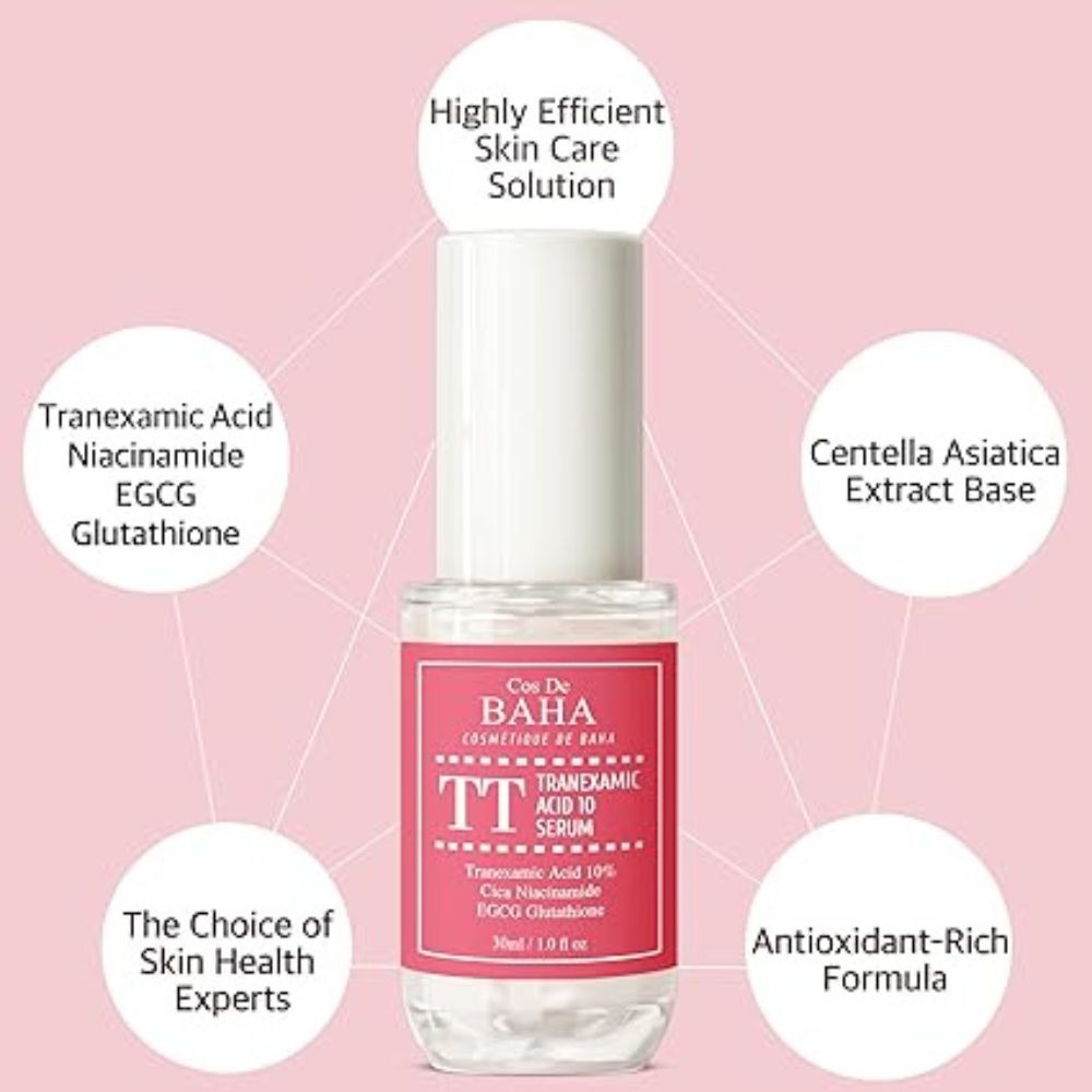 The Cos De BAHA TT Tranexamic Acid Facial Serum is a powerful brightening treatment designed to fade dark spots, hyperpigmentation, and uneven skin tone. Infused with 5% Tranexamic Acid, this serum helps inhibit melanin production, reducing discoloration while strengthening the skin barrier. Combined with Niacinamide, Alpha Arbutin, and Hyaluronic Acid, it not only promotes a radiant complexion but also provides deep hydration, leaving your skin looking smooth, plump, and healthy.