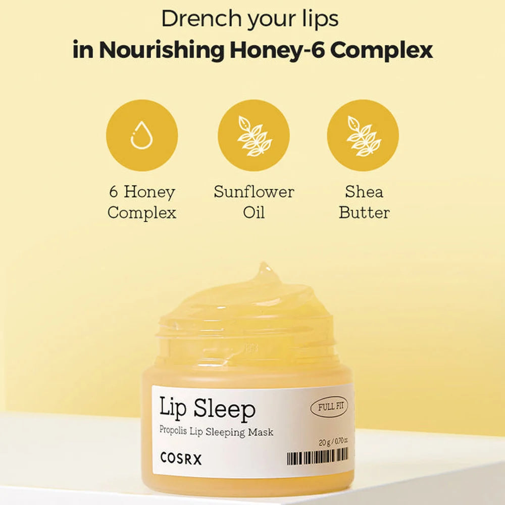 Wake up to soft, plump lips with the COSRX Full Fit Propolis Lip Sleeping Mask. Infused with propolis extract, honey, and natural nourishing oils, this overnight lip treatment deeply hydrates and repairs dry, chapped lips. Its rich yet non-sticky formula locks in moisture, leaving your lips smooth, supple, and healthy-looking by morning.