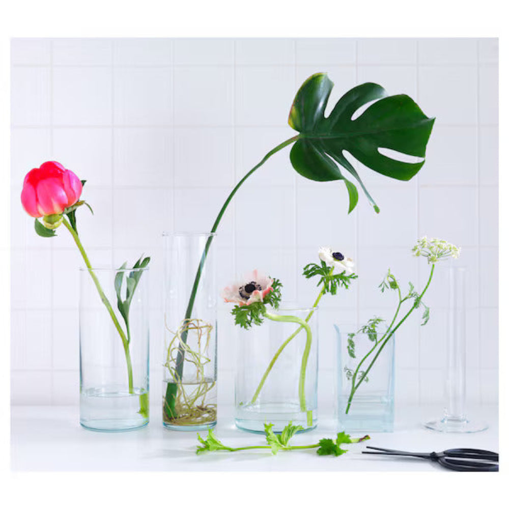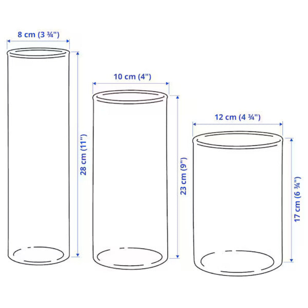 Save space and elevate your home decor with our CYLINDER set. Three vases (28cm, 23cm, and 17cm) stack neatly inside each other for easy storage. Made with potentially recyclable material, these vases are versatile and safe to use for both flowers and decorations. Caution: heat and sharp objects may cause glass to break.