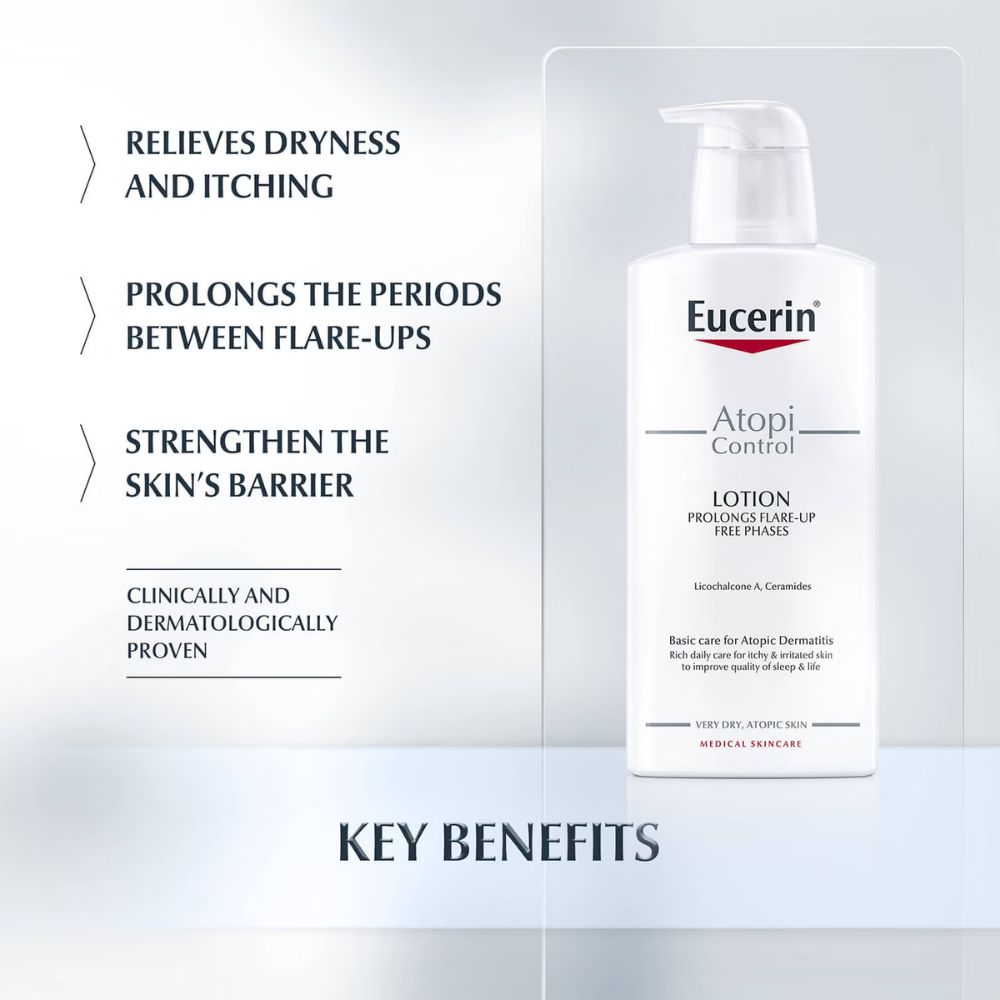Experience soothing relief and smooth, hydrated skin with Eucerin AtopiControl Body Lotion, perfect for sensitive skin prone to dryness and irritation.