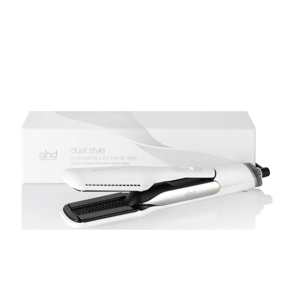 Designed to streamline your routine, this tool also features Shine Shot™ mode for styling on dry hair, enhancing shine, and alignment, leaving your hair touchably soft for up to 48 hours. With low-noise technology and energy-efficient performance, the GHD Duet in White is perfect for achieving smooth, polished hair every day.