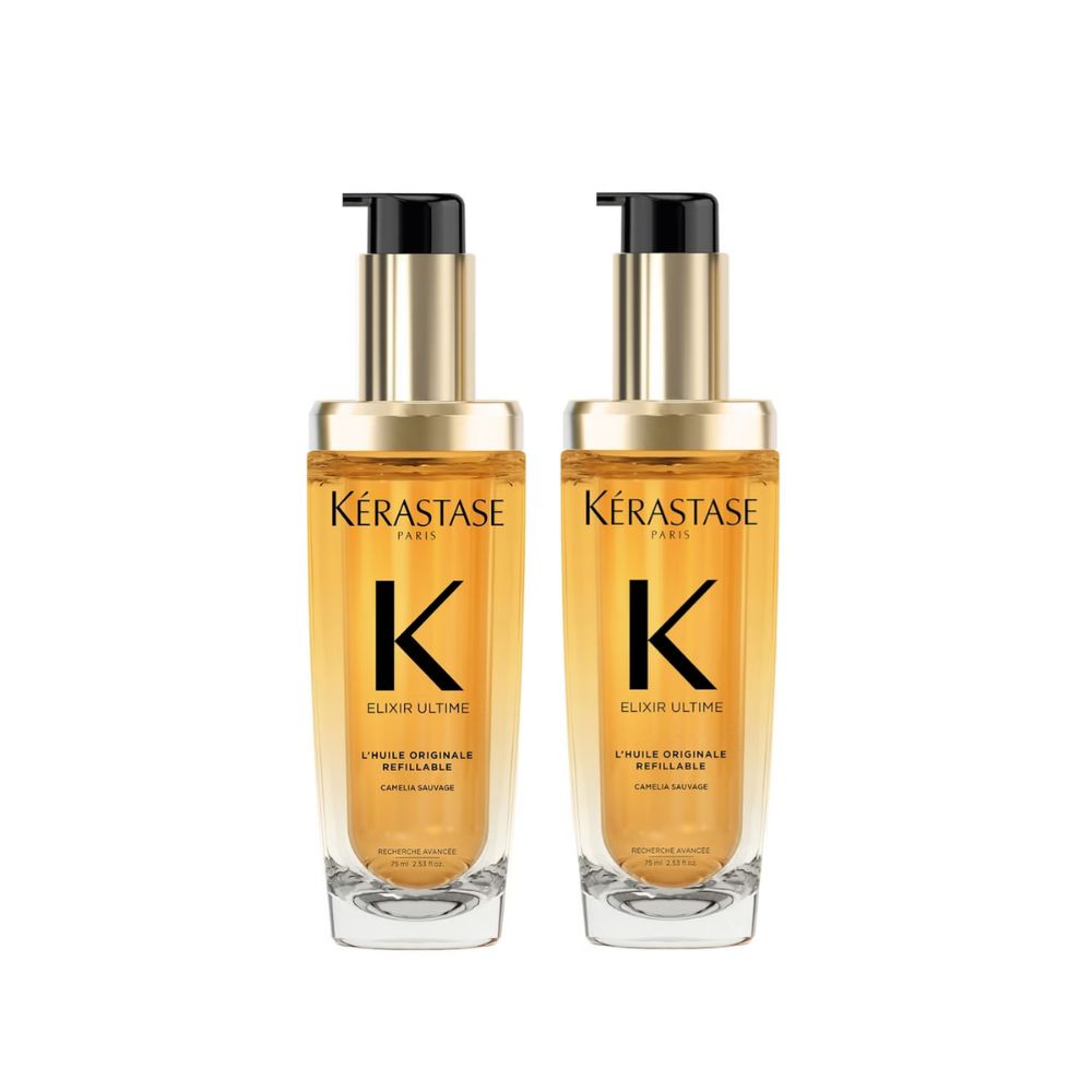 Indulge in luxurious, healthier-looking hair with the Kérastase Elixir Ultime Original Refillable Hair Oil Duo—now in a sustainable, refillable design.