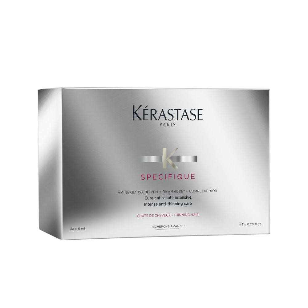 Kérastase Specifique Cure Anti-Chute Treatment is a potent solution designed to help combat hair loss and promote healthier, thicker hair. This intensive scalp treatment comes with 42 ampoules (6ml each) to offer a 6-week regimen. The formula is packed with active ingredients that stimulate hair regrowth, prevent shedding, and nourish the scalp to improve hair density and strength. Ideal for anyone experiencing thinning or temporary hair loss, this treatment revitalizes the scalp and restores hair vitality.