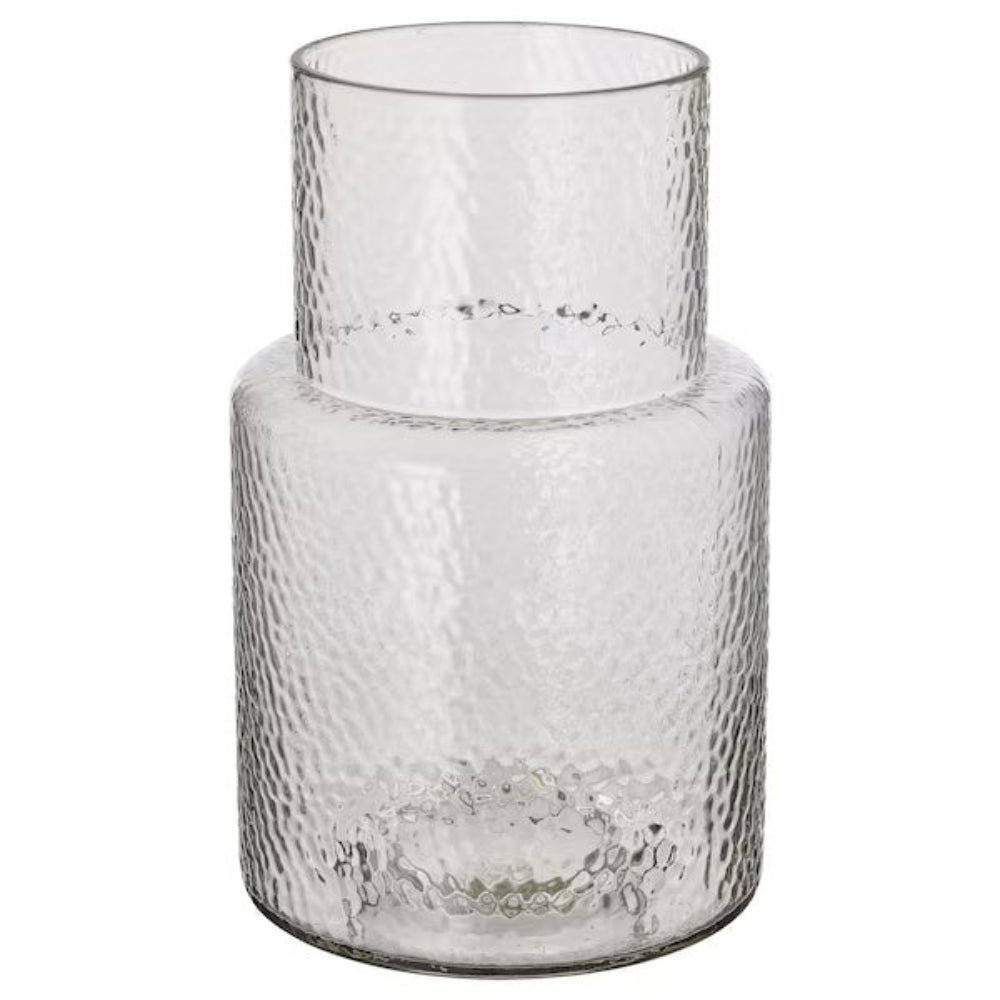 This tall semi-transparent glass vase with texture has a shimmering surface and goes nice with something like long and elegant roses or other bouquets.