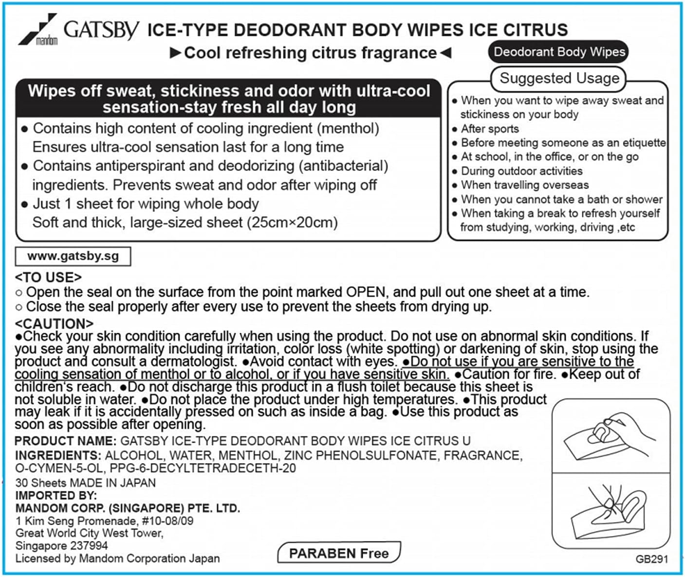 Stay cool and refreshed anytime, anywhere with Gatsby Ice Type Deodorant Body Wipes by Mandom Japan. These ultra-cooling wipes instantly remove sweat, dirt, and body odor while leaving your skin feeling icy fresh with a zesty Ice Citrus fragrance.