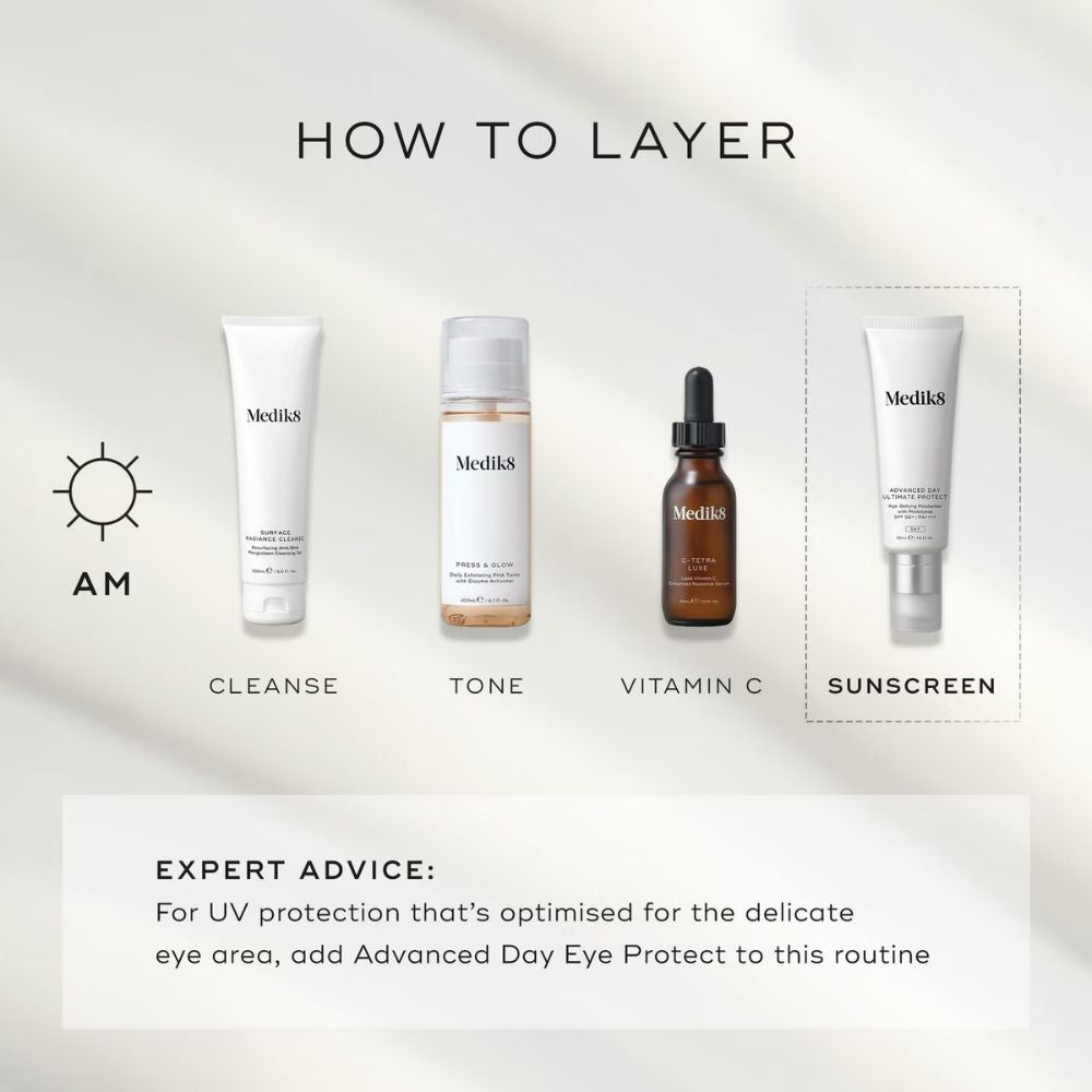 Protect and nourish your skin with Medik8 Advanced Day Ultimate Protect SPF50+, a multi-functional moisturizer with broad-spectrum UVA/UVB protection, DNA repair enzymes, and hydrating actives. This lightweight yet intensely protective formula defends against UV rays, blue light, pollution, and infrared damage, making it the ultimate daily shield for healthy, radiant skin.