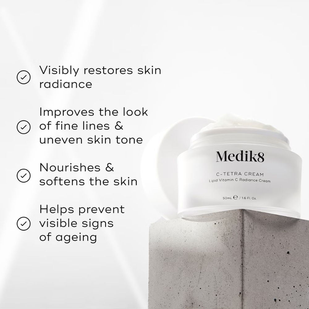 Revitalize your skin with Medik8 C-Tetra Cream, a luxurious daily moisturizer infused with stabilized vitamin C and vitamin E to brighten, hydrate, and protect against environmental stressors. This lightweight yet nourishing formula helps to boost collagen production, improve skin tone, and restore a radiant glow, making it an essential step in any anti-aging skincare routine.