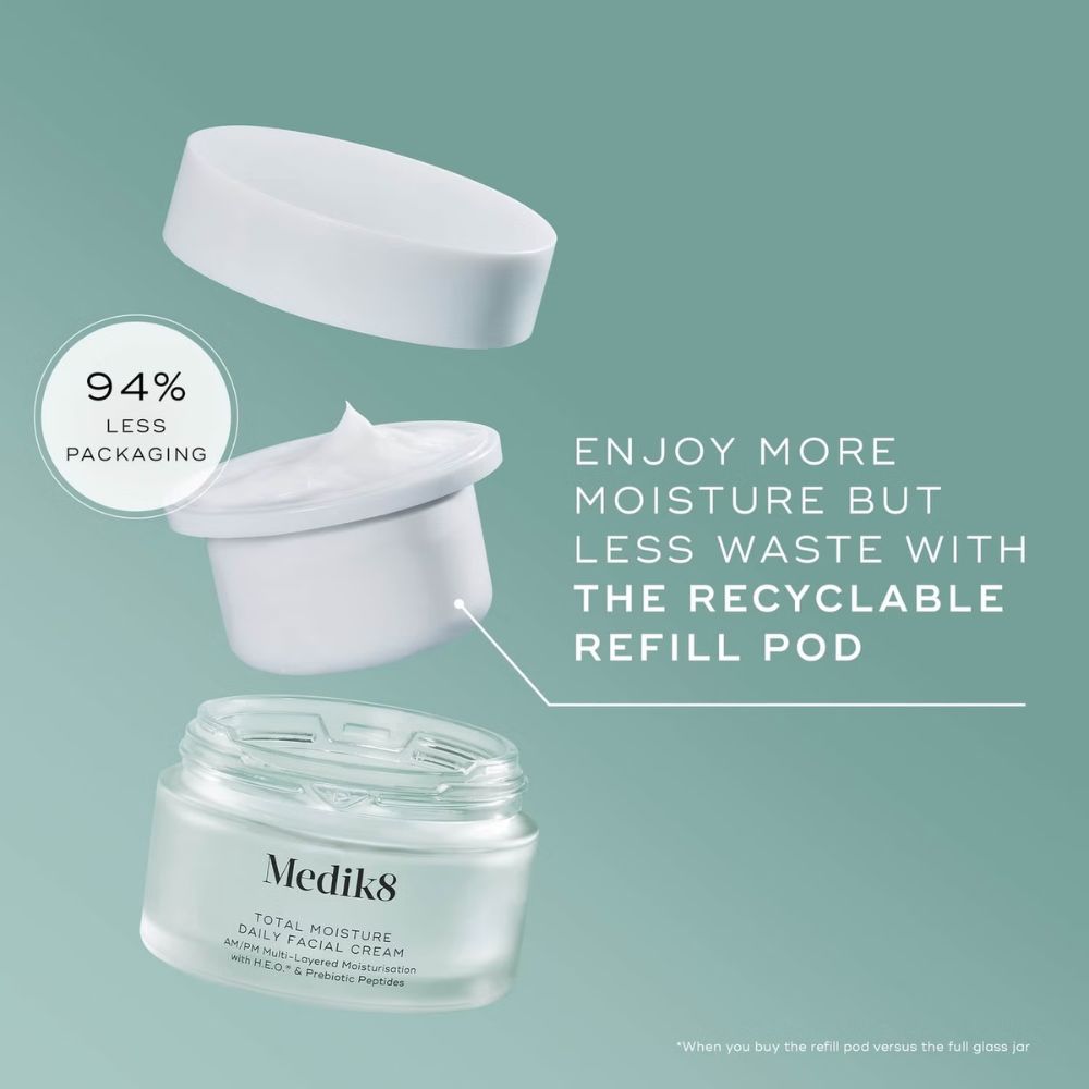 Experience long-lasting hydration while making an eco-conscious choice with the Medik8 Total Moisture Daily Facial Cream Refill. Designed to replenish your existing jar, this rich yet lightweight daily moisturizer is infused with hyaluronic acid, glycerin, and squalane to deeply hydrate and plump the skin. Antioxidant-rich red algae extract and vitamin E help defend against environmental stressors, promoting a healthy, radiant complexion.