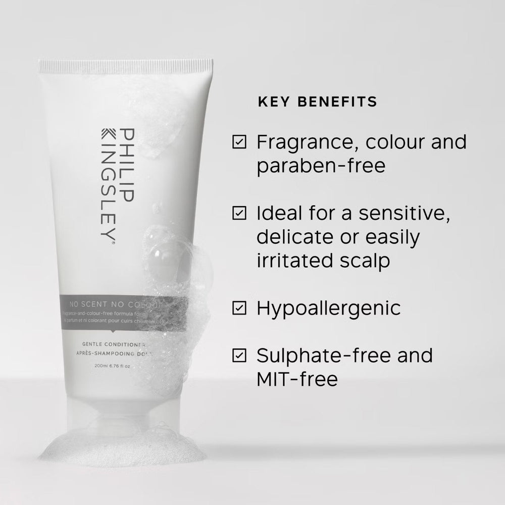 The Philip Kingsley No Scent No Colour Gentle Conditioner is a fragrance-free and dye-free conditioner designed for those with sensitive skin or scalp. This hypoallergenic formula provides gentle hydration and detangling without causing irritation, making it ideal for individuals with allergies, sensitivities, or conditions like eczema or psoriasis. It’s perfect for daily use and leaves hair feeling soft, smooth, and manageable.