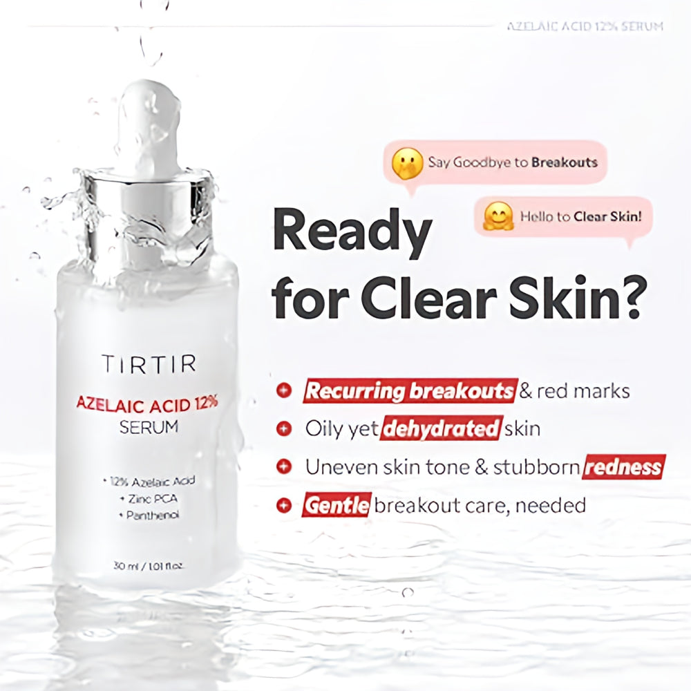 Reveal clearer, smoother skin with the TIRTIR Azelaic Acid 12% Serum — a potent yet gentle solution for acne-prone, dull, or uneven skin. Powered by 12% azelaic acid, this serum works to brighten skin tone, unclog pores, and calm inflammation, making it ideal for those struggling with blemishes, redness, or post-acne marks.