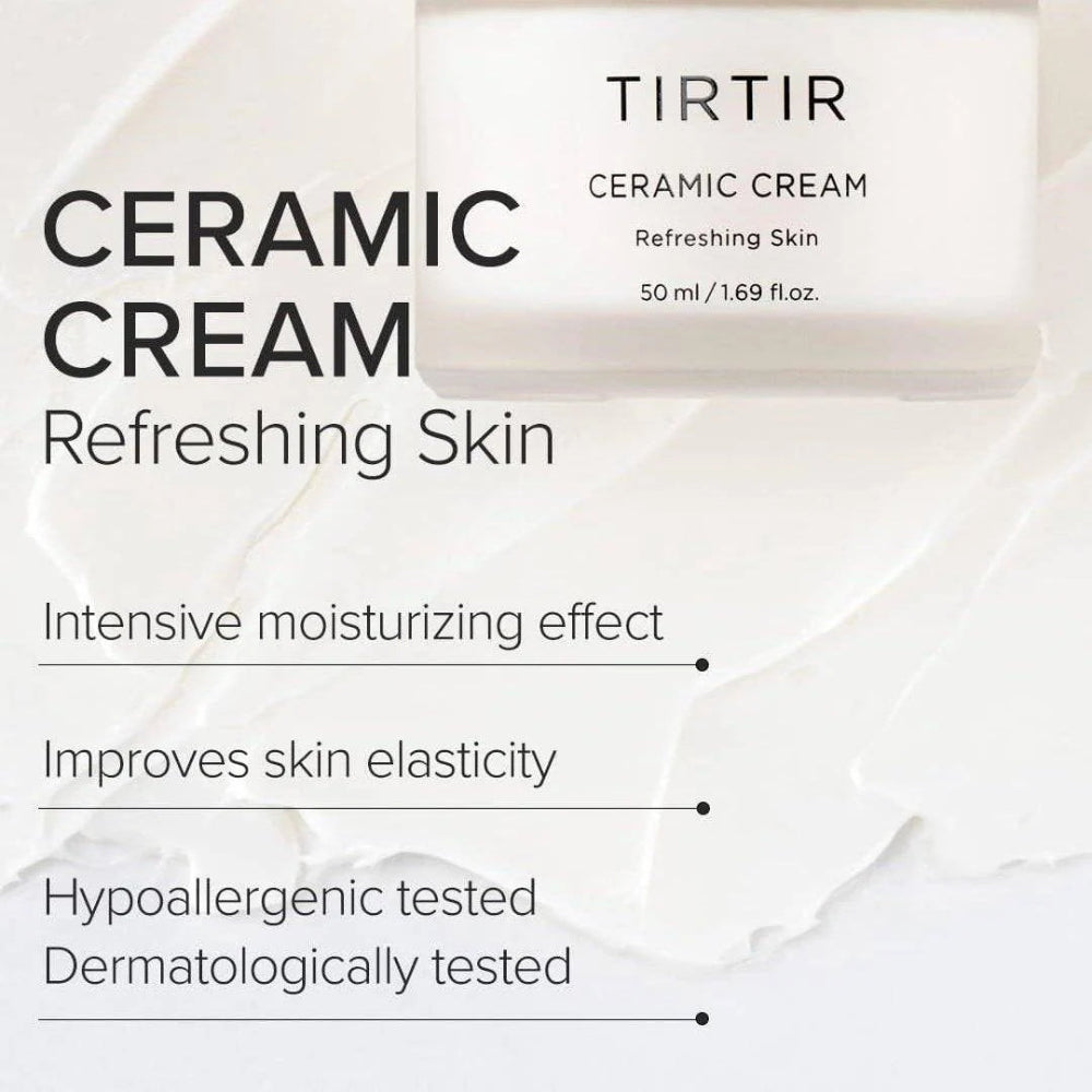 The TIRTIR Ceramic Cream Light is a lightweight moisturizing cream designed to strengthen the skin barrier and deliver long-lasting hydration without heaviness. Formulated with ceramides, panthenol, and hyaluronic acid, it helps lock in moisture, smooth skin texture, and protect against environmental stress.