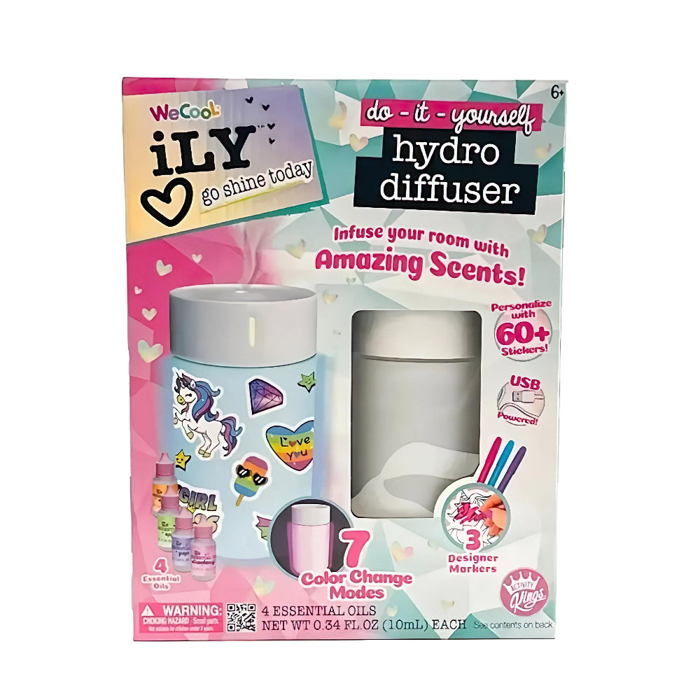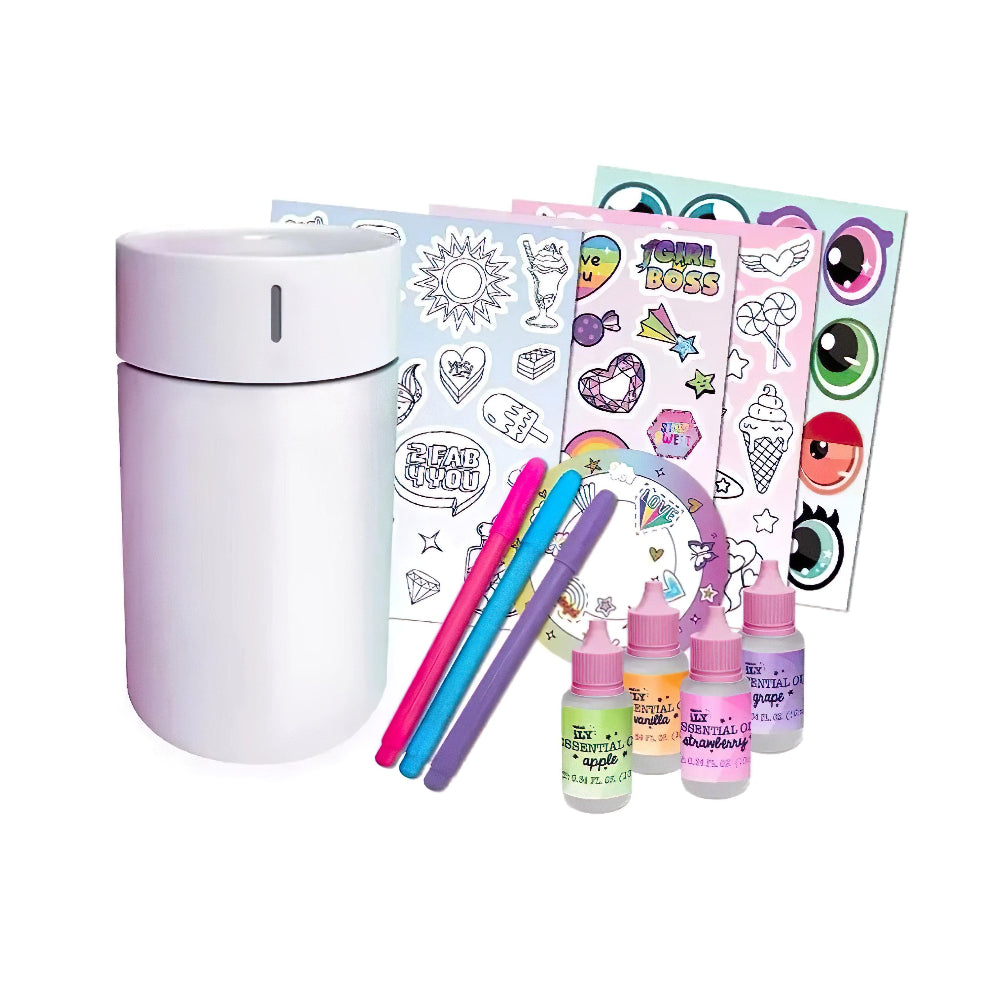 Create your own soothing space with the WeCooL ILY DIY Hydro Diffuser. This hands-on kit is perfect for kids and tweens who love to personalize their space while enjoying relaxing aromas. The set includes a white diffuser that can be customized with included stickers and markers, plus essential oil blends to fill the room with calming scents. With color-changing LED lights, this diffuser is both a creative activity and a functional room accessory.